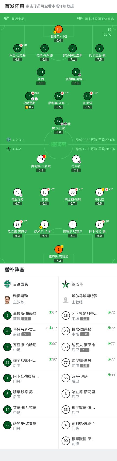 北京时间2月20日沙特阿拉伯联 联赛 第23轮,吉达国民主场对阵纳杰马。吉达国民瓦朗坦-阿坦加纳破门,伊万-托尼帽子戏法。纳杰马拉萨罗破门。最终比分吉达国民 4-1 纳杰马。精彩瞬间第27分钟,纳杰马球员蒂亚尼奇助攻拉萨罗打入一球。第37分钟,吉达国民球员伊万-托尼将点球罚丢。第48分钟,吉达国民球员马赫雷斯助攻瓦朗坦-阿坦加纳打入一球。第58分钟,纳杰马球...